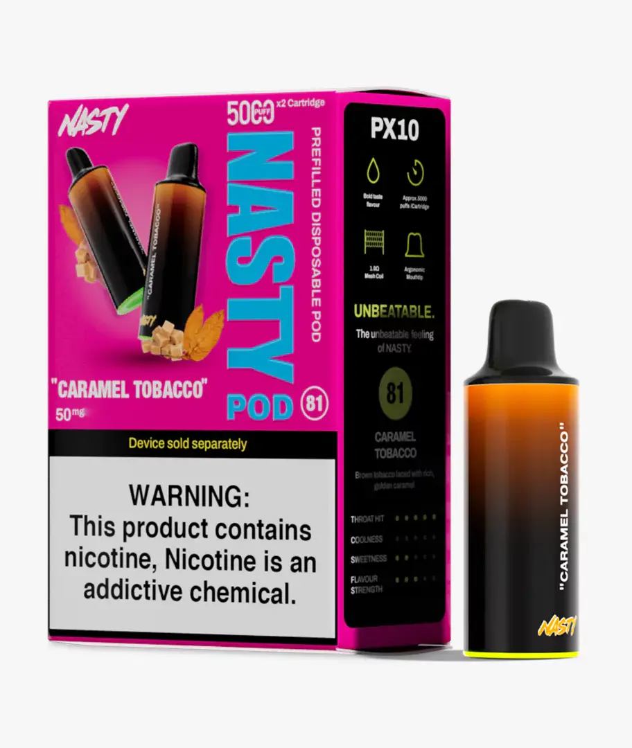 The NASTY POD PX10 is a Nicotine Salt Disposable Pod Device designed to deliver maximum flavour performance of up to 5,000 puffs.